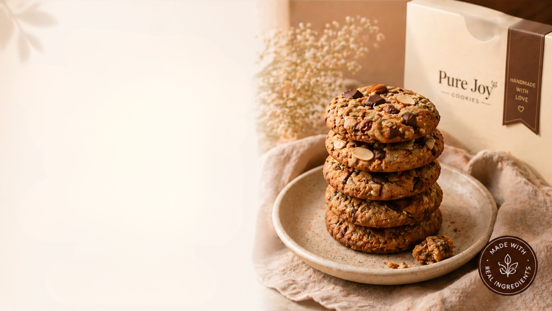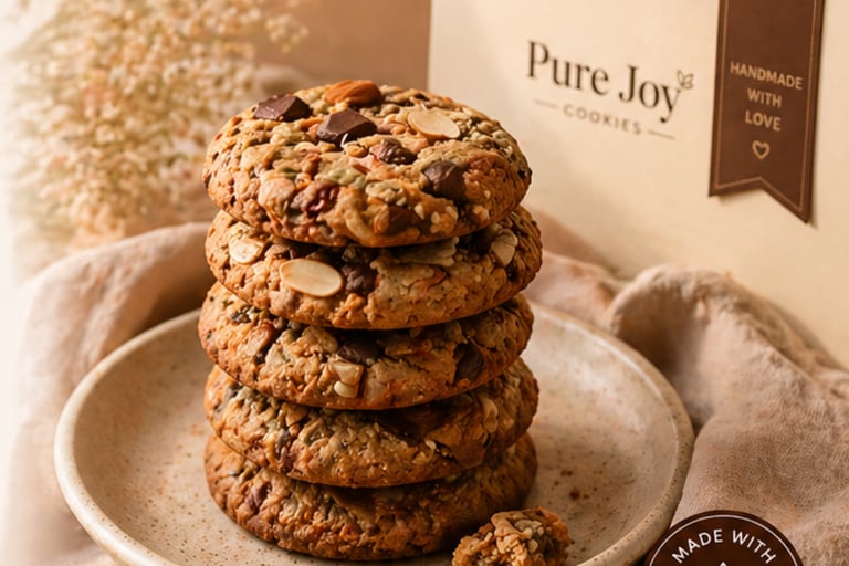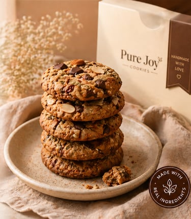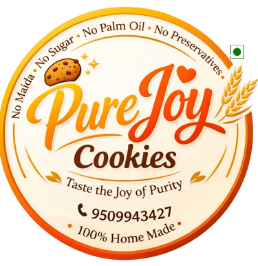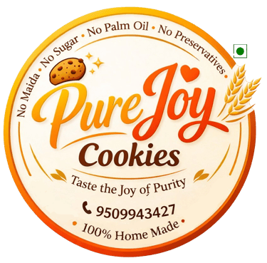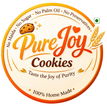 At Pure Joy, we bake cookies that are as wholesome as they are delicious. Made with clean, natural ingredients and no maida, no preservatives, our cookies are crafted to bring happiness to your everyday moments. Because every bite deserves to be guilt-free and full of joy.